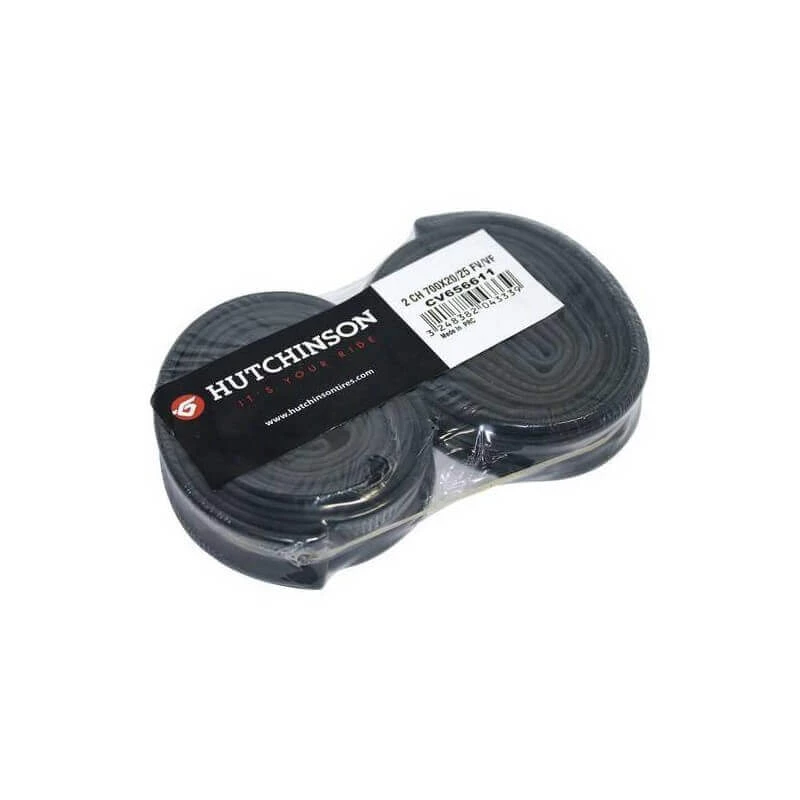 Pack 2 Cámaras Hutchinson 26×1.70-2.35 Schrader 40mmConjunto compuesto de dos cámaras de butilo con válvula schrader o moto, para cubiertas de 26″ de diámetro y grosor entre 1.70 y 2.35.ETRTO 47/58 – 559Peso aprox.: 190gr./cámara